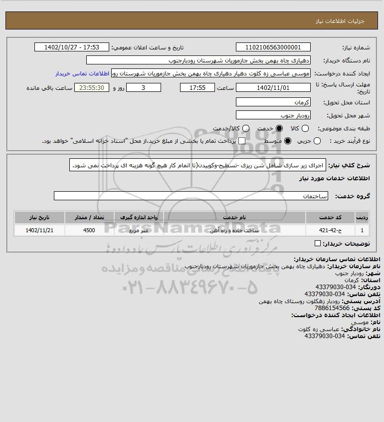شرح کلی نیاز: اجرای زیر سازی شامل شن ریزی -تسطیح-وکوبیدن(تا اتمام کار هیچ گونه هزینه ای پرداخت نمی شود.