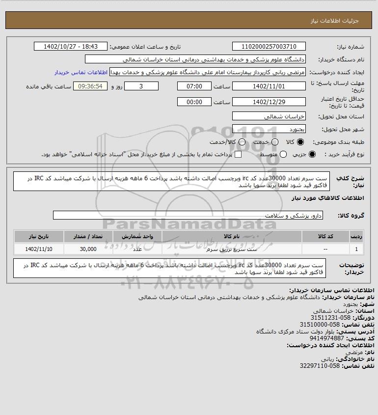 نام دستگاه خریدار:دانشگاه علوم پزشکی و خدمات بهداشتی درمانی استان خراسان شمالی