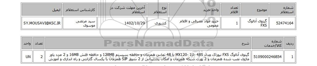 | 52474164 | گیتوی آنالوگ FXS | 1 | خرید مواد مصرفی و اقلام عمومی | کشوری | 1402/10/29 | سید مرتضی موسوی | SY.MOUSAVI@KSC.IR |