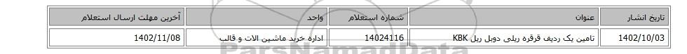 | 1402/10/03 | تامین یک ردیف قرقره ریلی دوبل ریل KBK | 14024116 | اداره خرید ماشین الات و قالب | 1402/11/08 |