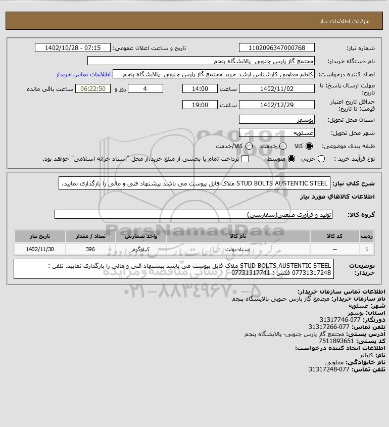 توضیحات خریدار:STUD BOLTS AUSTENTIC STEEL ملاک فایل پیوست می باشد پیشنهاد فنی و مالی را بارگذاری نمایید. تلفن : 07731317248 فکس : 07731317741