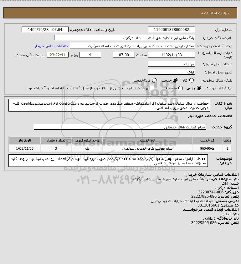 شرح کلی نیاز: حفاظت ازاموال منقول وغیر منقول (قرارداد3ماهه منعقد میگردددر صورت لزومتایید دوره دیگرباهمان نرخ تمدیدمیشوددارابودن کلیه مجوزاتخصوصا مجوز نیروی انتظامی