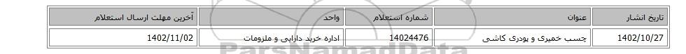 | 1402/10/27 | چسب خمیری و پودری کاشی | 14024476 | اداره خرید دارایی و ملزومات | 1402/11/02 |