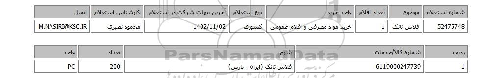 | 52475748 | فلاش تانک | 1 | خرید مواد مصرفی و اقلام عمومی | کشوری | 1402/11/02 | محمود نصیری | M.NASIRI@KSC.IR |