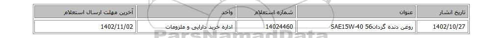 | 1402/10/27 | روغن دنده گردان56 SAE15W-40 | 14024460 | اداره خرید دارایی و ملزومات | 1402/11/02 |