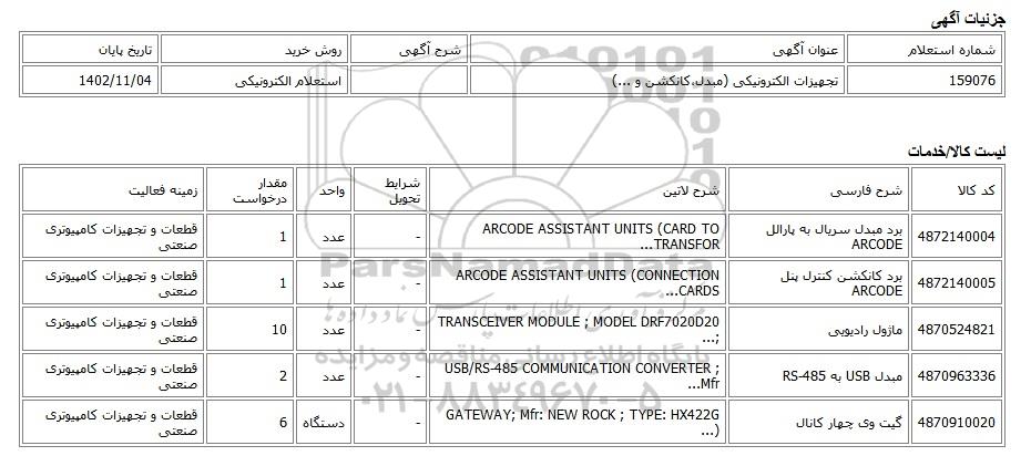 | 159076 | تجهیزات الکترونیکی (مبدل،کانکشن و ...) | استعلام الکترونیکی | 1402/11/04 |