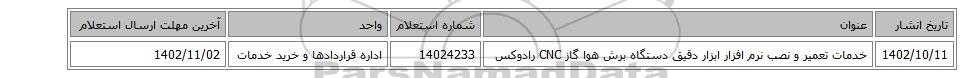 1402/10/11خدمات تعمیر و نصب نرم افزار ابزار دقیق دستگاه برش هوا گاز CNC رادوکس14024233اداره قراردادها و خرید خدمات1402/11/02