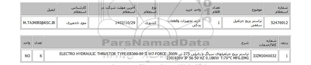 | 52476912 | تراستر بریج جرثقیل سقفی | 1 | خرید تجهیزات وقطعات یدکی | کشوری | 1402/10/29 | محمد تاجمیری | M.TAJMIRI@KSC.IR |