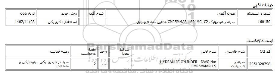 | 160150 | سیلندر هیدرولیک CMP5MMARLLS24MC- C2 مطابق نقشه ودیتیل | استعلام الکترونیکی | 1402/11/03 |