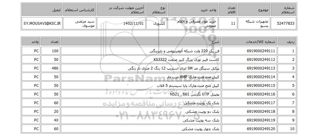 52477833تجهیزات شبکه پسیو 11خرید مواد مصرفی و اقلام عمومیکشوری1402/11/01سید مرتضی موسویSY.MOUSAVI@KSC.IR