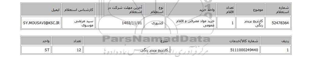 | 52478364 | کارتریج پرینتر رنگی | 1 | خرید مواد مصرفی و اقلام عمومی | کشوری | 1402/11/01 | سید مرتضی موسوی | SY.MOUSAVI@KSC.IR |