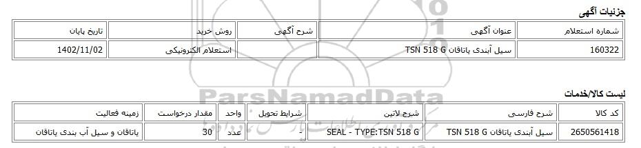 | 160322 | سیل آبندی یاتاقان TSN 518 G | استعلام الکترونیکی | 1402/11/02 |