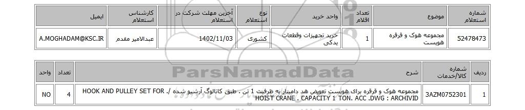 | 52478473 | مجموعه هوک و قرقره هویست | 1 | خرید تجهیزات وقطعات یدکی | کشوری | 1402/11/03 | عبدالامیر مقدم | A.MOGHADAM@KSC.IR |