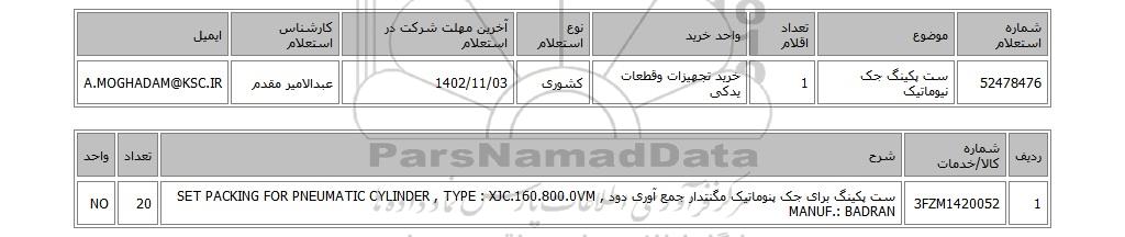 | 52478476 | ست پکینگ جک نیوماتیک | 1 | خرید تجهیزات وقطعات یدکی | کشوری | 1402/11/03 | عبدالامیر مقدم | A.MOGHADAM@KSC.IR |