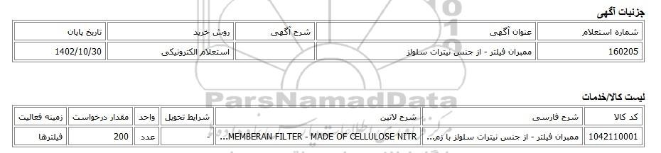 | 160205 | ممبران فیلتر - از جنس نیترات سلولز | استعلام الکترونیکی | 1402/10/30 |