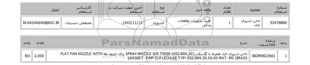 | 52478880 | ناخن اسپری نازل | 1 | خرید تجهیزات وقطعات یدکی | کشوری | 1402/11/12 | مصطفی حسنیان | M.HASANIAN@KSC.IR |