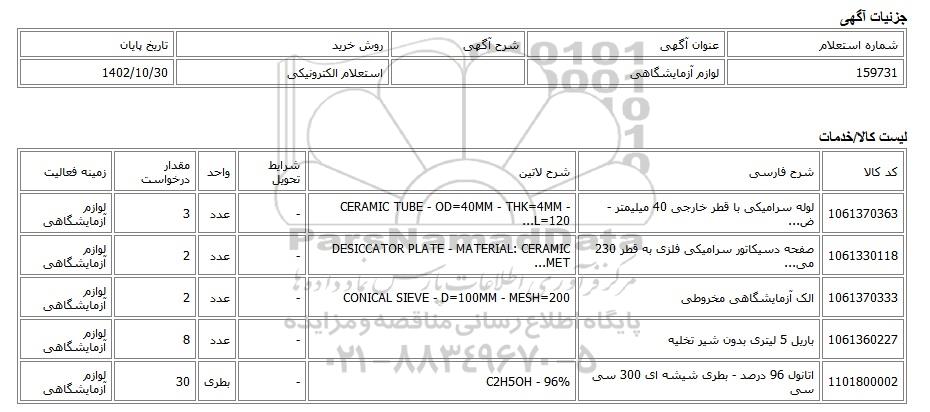 159731لوازم آزمایشگاهیاستعلام الکترونیکی1402/10/30