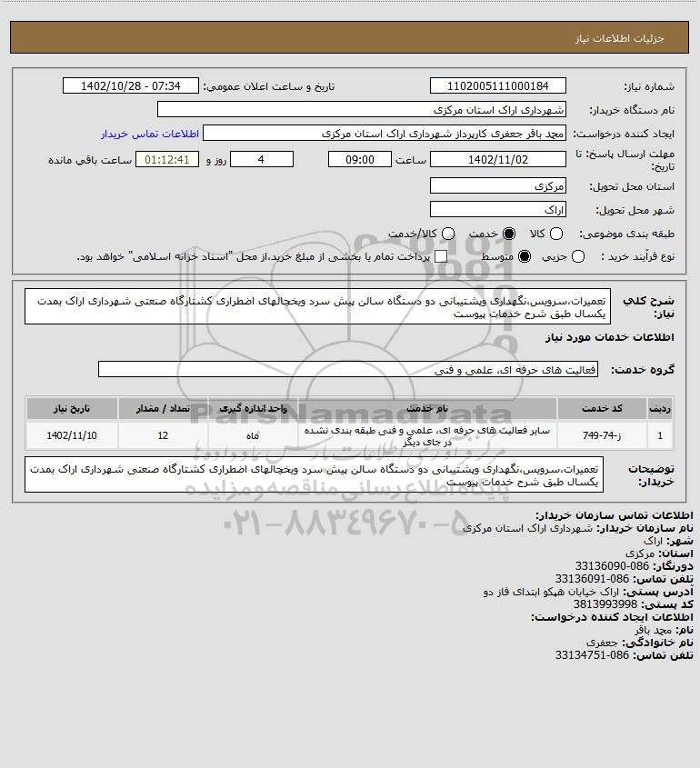 شرح کلی نیاز: تعمیرات،سرویس،نگهداری وپشتیبانی دو دستگاه سالن پیش سرد ویخچالهای اضطراری کشتارگاه صنعتی شهرداری اراک بمدت یکسال طبق شرح خدمات پیوست