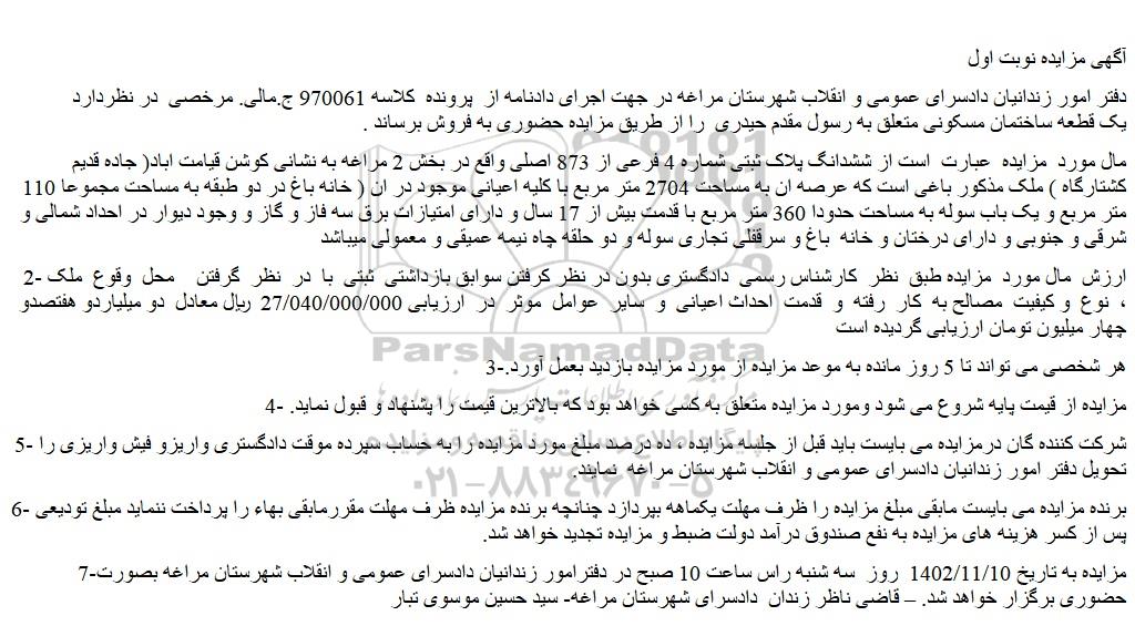 مال مورد مزایده عبارت است از ششدانگ پلاک ثبتی شماره 4 فرعی از 873 اصلی واقع در بخش 2 مراغه به نشانی کوشن قیامت اباد( جاده قدیم کشتارگاه ) ملک مذکور باغی است که عرصه ان به مساحت 2704 متر مربع با کلیه اعیانی موجود در ان ( خانه باغ در دو طبقه به مساحت مجموعا 110 متر مربع و یک باب سوله به مساحت حدودا 360 متر مربع با قدمت بیش از 17 سال و دارای امتیازات برق سه فاز و گاز و وجود دیوار در احداد شمالی و شرقی و جنوبی و دارای درختان و خانه باغ و سرقفلی تجاری سوله و دو حلقه چاه نیمه عمیقی و معمولی میباشد