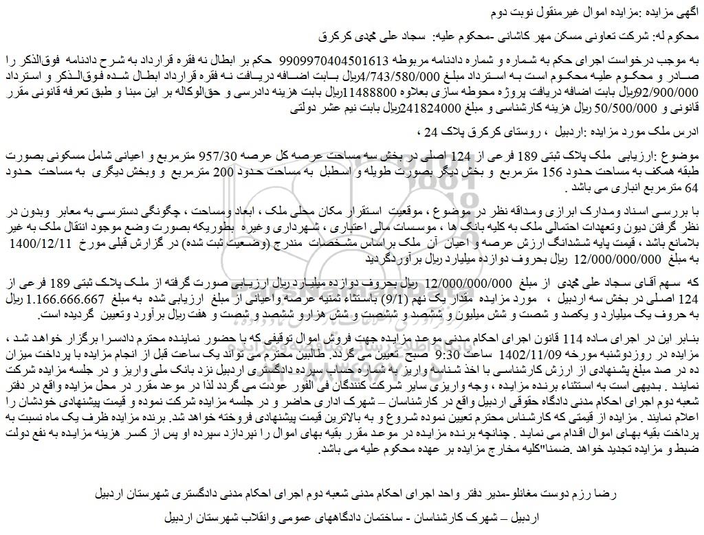 که سهم آقای سجاد علی محمدی از مبلغ 12/000/000/000 ریال بحروف دوازده میلیارد ریال ارزیابی صورت گرفته از ملک پلاک ثبتی 189 فرعی از 124 اصلی در بخش سه اردبیل ، مورد مزایده مقدار یک نهم (9/1) باستثاء ثمنیه عرصه واعیانی از مبلغ ارزیابی شده به مبلغ 1.166.666.667 ریال به حروف یک میلیارد و یکصد و شصت و شش میلیون و ششصد و ششصت و شش هزارو ششصد و شصت و هفت ریال برآورد وتعیین گردیده است.
