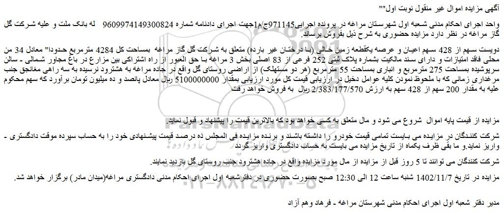 دویست سهم از 428 سهم اعیان و عرصه یکقطعه زمین خالی (با درختان غیر بارده) متعلق به شرکت گل گاز مراغه بمساحت کل 4284 مترمربع حدودا" معادل 34 من محلی فاقد امتیازات و دارای سند مالکیت بشماره پلاک ثبتی 252 فرعی از 83 اصلی بخش 3 مراغه با حق العبور از راه اشتراکی بین مزارع در باغ مجاور شمالی - سالن سرپوشیده بمساحت 275 مترمربع و انباری بمساحت 55 مترمربع (هر دو مستهلک) از اراضی روستای گل واقع در جاده مراغه به هشترود نرسیده به سه راهی مغانجق جنب مرغداری زمانی که با ملحوظ نمودن کلیه عوامل دخیل در ارزیابی قیمت کل مورد ارزیابی بمقدار 5100000000 ریال معادل پانصد و ده میلیون تومان برآورد که سهم محکوم علیه به مقدار 200 سهم از 428 سهم به ارزش 2/383/177/570 ریال به فروش خواهد رفت