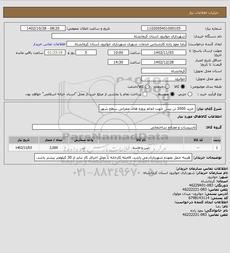 شرح کلی نیاز: خرید 2000 تن بیس جهت انجام پروژه های عمرانی سطح شهر