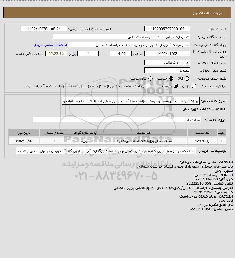 شرح کلی نیاز: پروژه اجرا با مصالح تعمیر و مرمت موزاییک سنگ مصنوعی و بتن لیسه ای سطح منطقه دو