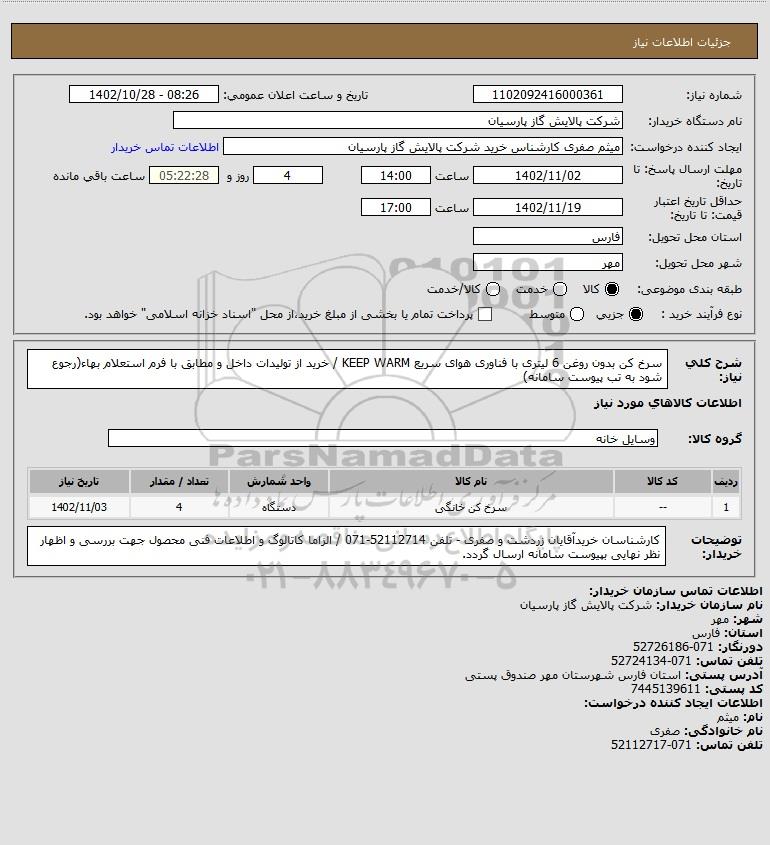 نام دستگاه خریدار:شرکت پالایش گاز پارسیان