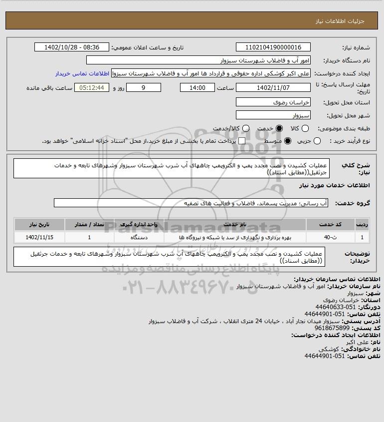 شرح کلی نیاز: عملیات کشیدن و نصب مجدد پمپ و الکتروپمپ چاههای آب شرب شهرستان سبزوار وشهرهای تابعه و خدمات جرثقیل((مطابق اسناد))