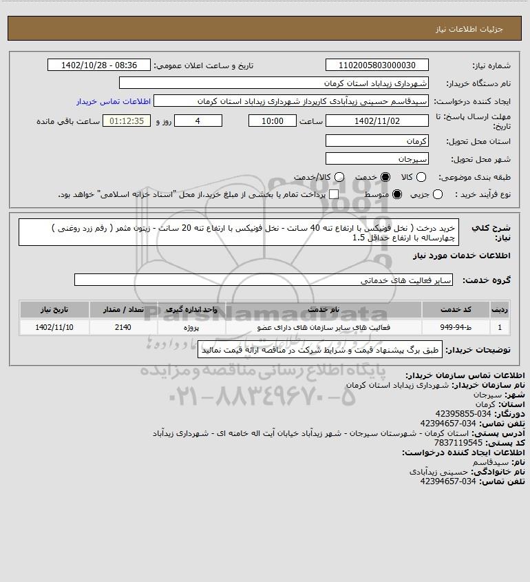 شرح کلی نیاز: خرید درخت ( نخل فونیکس با ارتفاع تنه 40 سانت - نخل فونیکس با ارتفاع تنه 20 سانت - زیتون مثمر ( رفم زرد روغنی ) چهارساله با ارتفاع حداقل 1.5