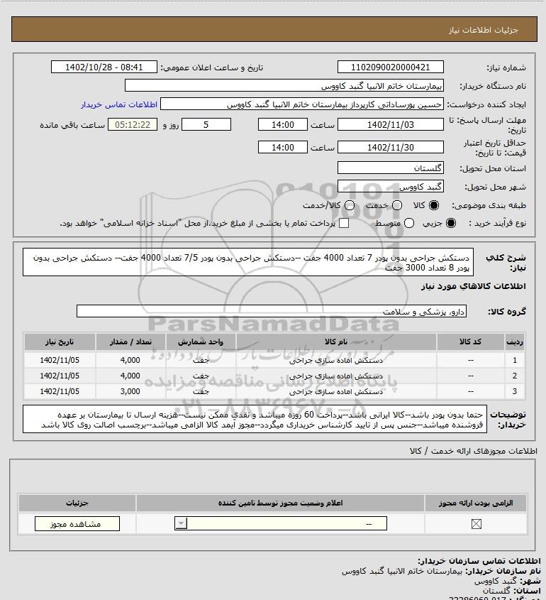 | 3 | -- | دستکش اماده سازی جراحی | جفت | 3,000 | 1402/11/05 |