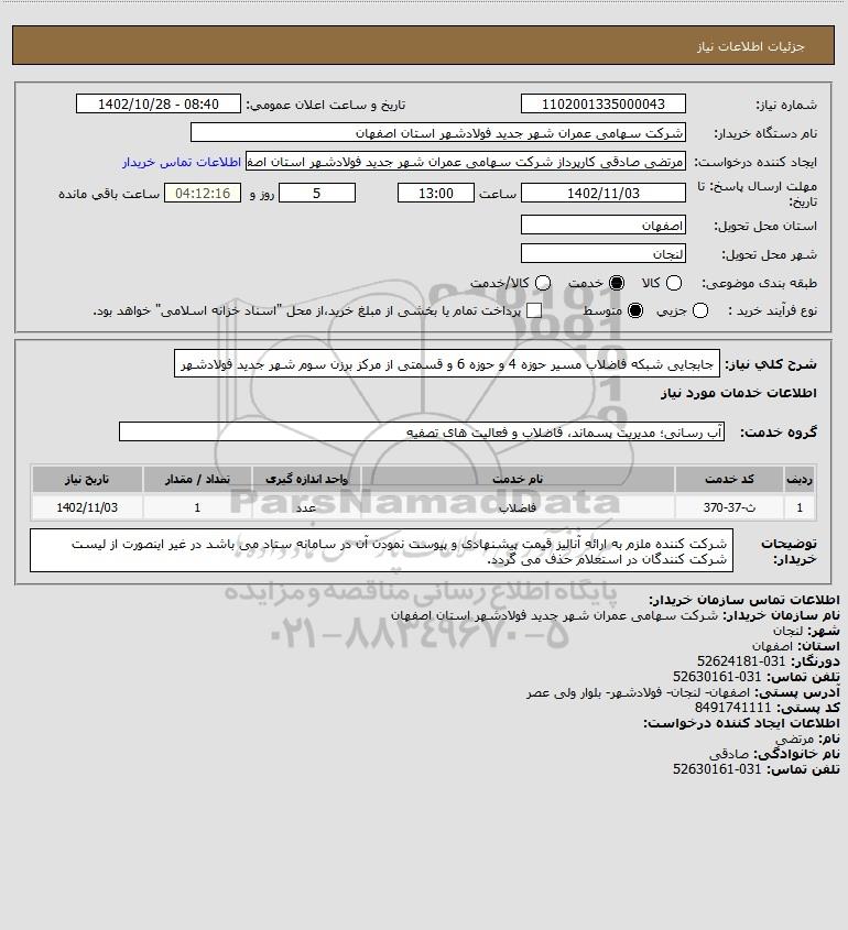 شرح کلی نیاز: جابجایی شبکه فاضلاب مسیر حوزه 4 و حوزه 6 و قسمتی از مرکز برزن سوم شهر جدید فولادشهر