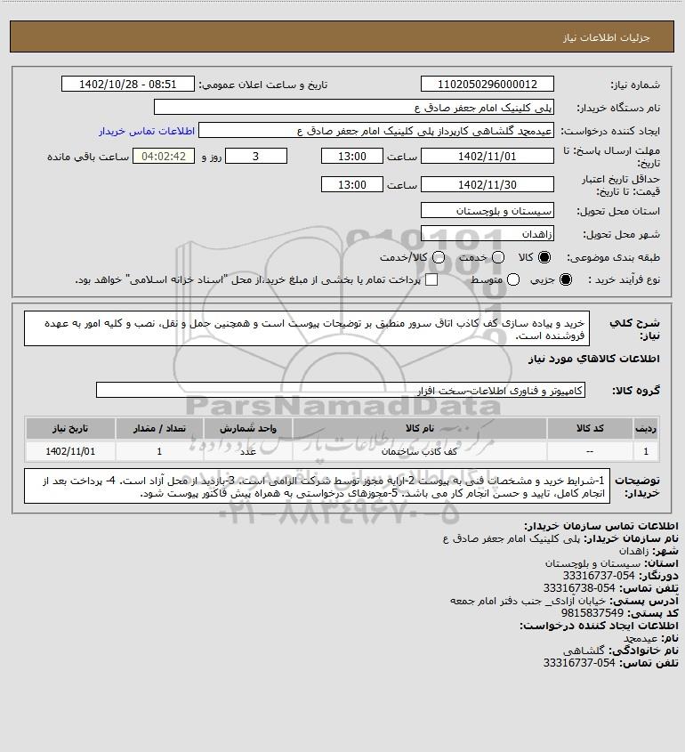 شرح کلی نیاز: خرید و پیاده سازی کف کاذب اتاق سرور منطبق بر توضیحات پیوست است و همچنین حمل و نقل، نصب و کلیه امور به عهده فروشنده است.