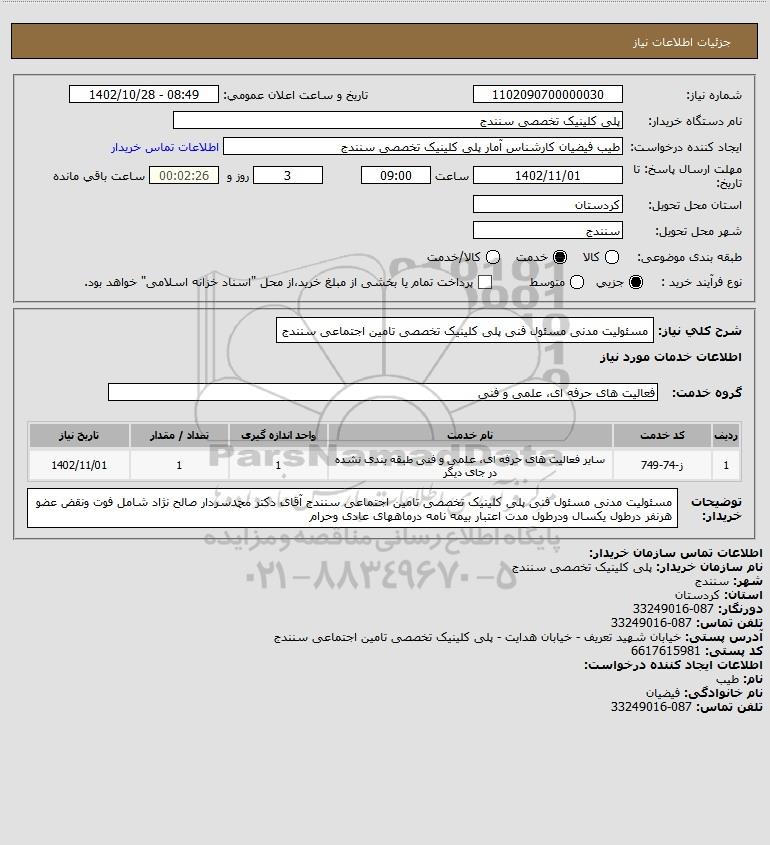 شرح کلی نیاز: مسئولیت مدنی مسئول فنی پلی کلینیک تخصصی تامین اجتماعی سنندج