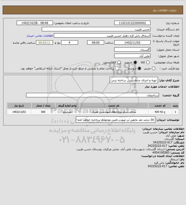 استعلام بها و موضوع استعلام استعلام تهیه و اجرای جدول پیش ساخته بتنی به اطلاع کلیه شرکتها و افراد متخصص واجد شرایط میرساند، آگهی گذار در نظر دارد از طریق استعلام بها، نسبت به انتخاب و دریافت پیشنهادات اقدام نماید. این استعلام با کد آگهی ثبت شده در سامانه خبرگزاری پارس نماد : 6928360 منتشر شده است. مشخصات استعلام : تاریخ شروع استعلام: 1402/10/28 آخرین مهلت ارسال پیشنهاد قیمت : 1402/11/02 و محل اجرای پروژه : استان گلستان میباشد. استعلام قیمت مورد درخواست : استعلام تهیه و اجرای جدول پیش ساخته بتنی با دستهبندیهای تخصصی و گروه های مرتبط : قطعات بتنی, دیوار و قطعات پیش ساخته, ساختمان, استعلام اطلاع رسانی میگردد.