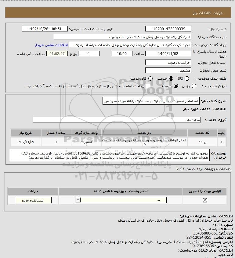 شرح کلی نیاز: استعلام تعمیرات سالن تجاری و مسافری پایانه مرزی سرخس