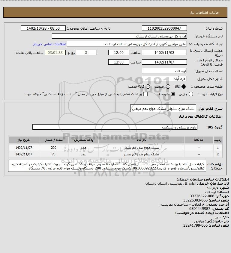 | 2 | -- | تشک مواج ضد زخم بستر | عدد | 70 | 1402/11/07 |