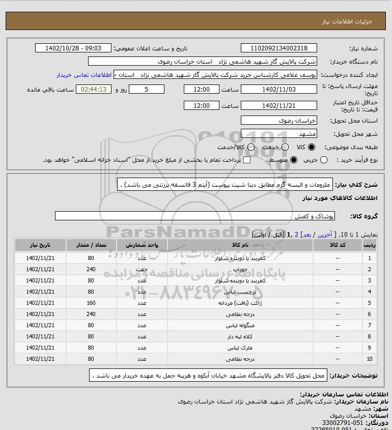 شرح کلی نیاز: ملزومات و البسه گرم مطابق دیتا شیت پیوست (آیتم 3 فانسقه برزنتی می باشد) .