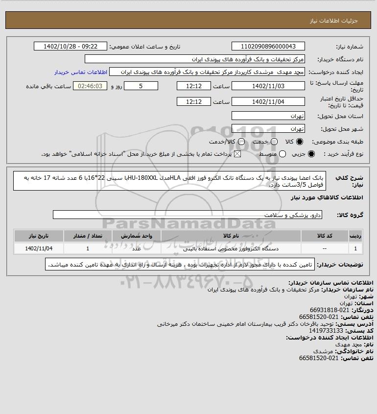 نام دستگاه خریدار:مرکز تحقیقات و بانک فرآورده های پیوندی ایران