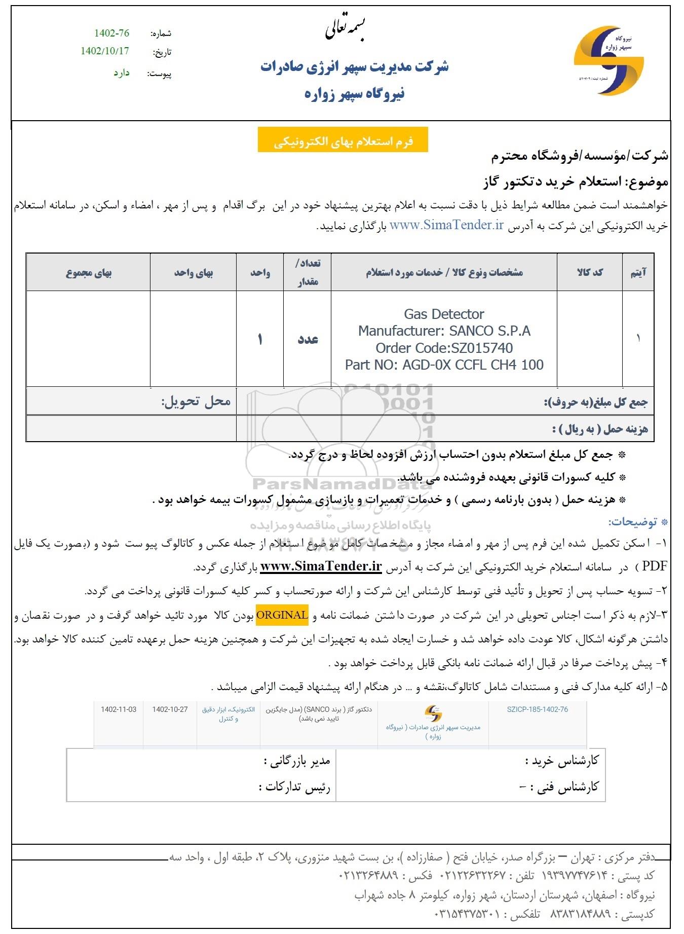 SZICP-185-1402-76  مدیریت سپهر انرژی صادرات (نیروگاه زواره) دتکتور گاز (برند SANCO) (مدل جایگزین تایید نمی باشد) الکترونیک، ابزار دقیق و کنترل 1402.10.27 1402.11.3