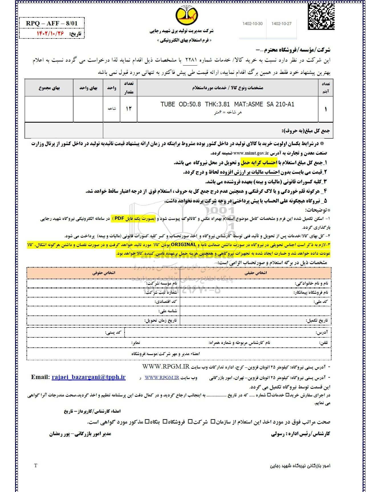 استعلام TUBE OD:50.8 THK:3.81 MAT:ASME SA 210-A1, استعلام TUBE OD:50.8 THK:3.81 MAT:ASME SA 210-A1