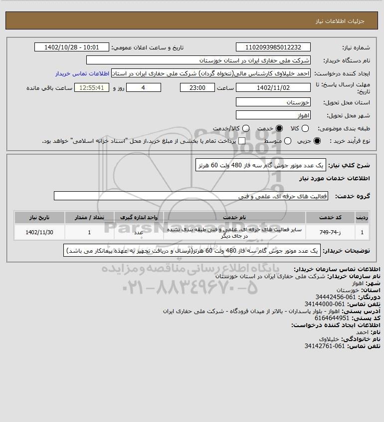 شرح کلی نیاز: یک عدد موتور جوش گام سه فاز 480 ولت 60 هرتز