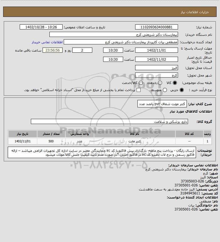 شرح کلی نیاز: کتتر مونت شفاف pvc پانصد عدد