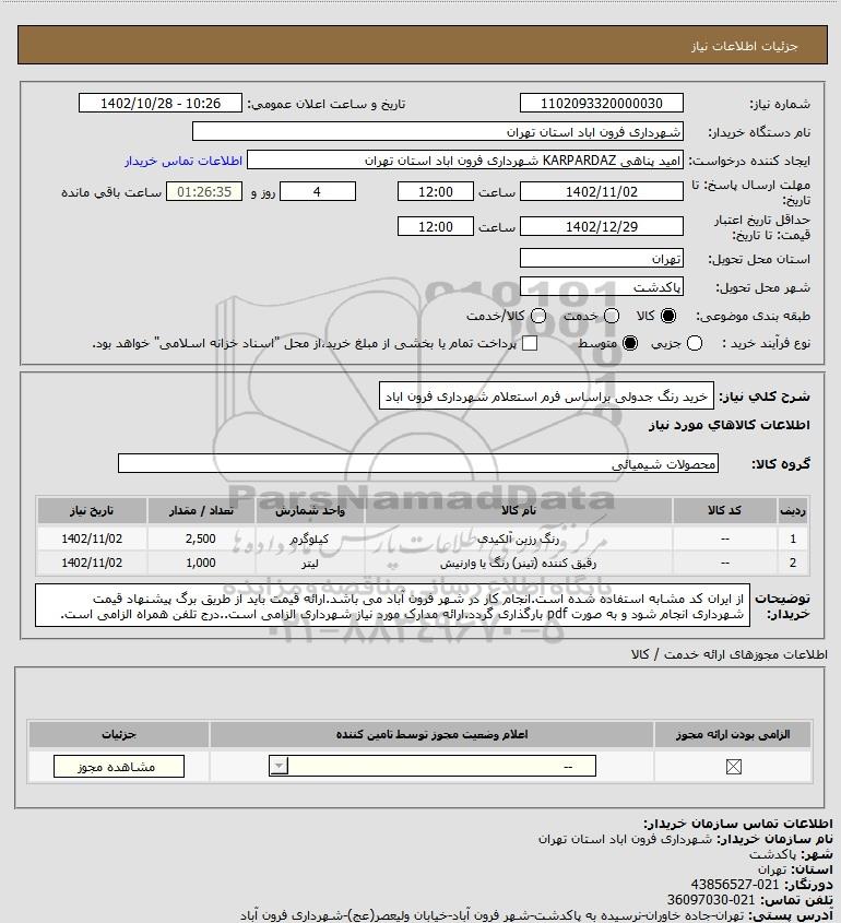 شرح کلی نیاز: خرید رنگ جدولی براساس فرم استعلام شهرداری فرون اباد