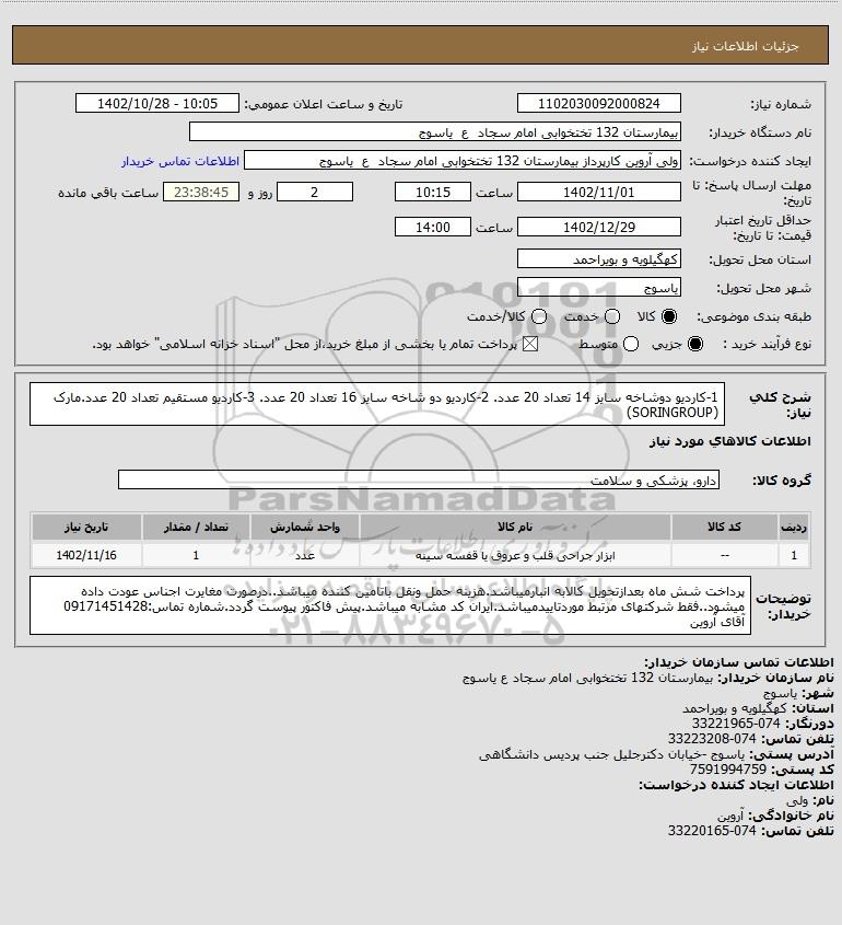 شرح کلی نیاز: 1-کاردیو دوشاخه سایز 14 تعداد 20 عدد. 2-کاردیو دو شاخه سایز 16 تعداد 20 عدد. 3-کاردیو مستقیم تعداد 20 عدد.مارک (SORINGROUP)