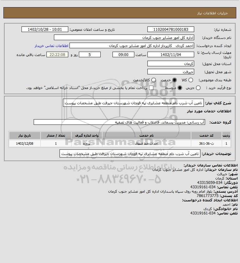 شرح کلی نیاز: تامین آب شرب دام منطقه عشایری تپه قوچان شهرستان جیرفت طبق مشخصات پیوست