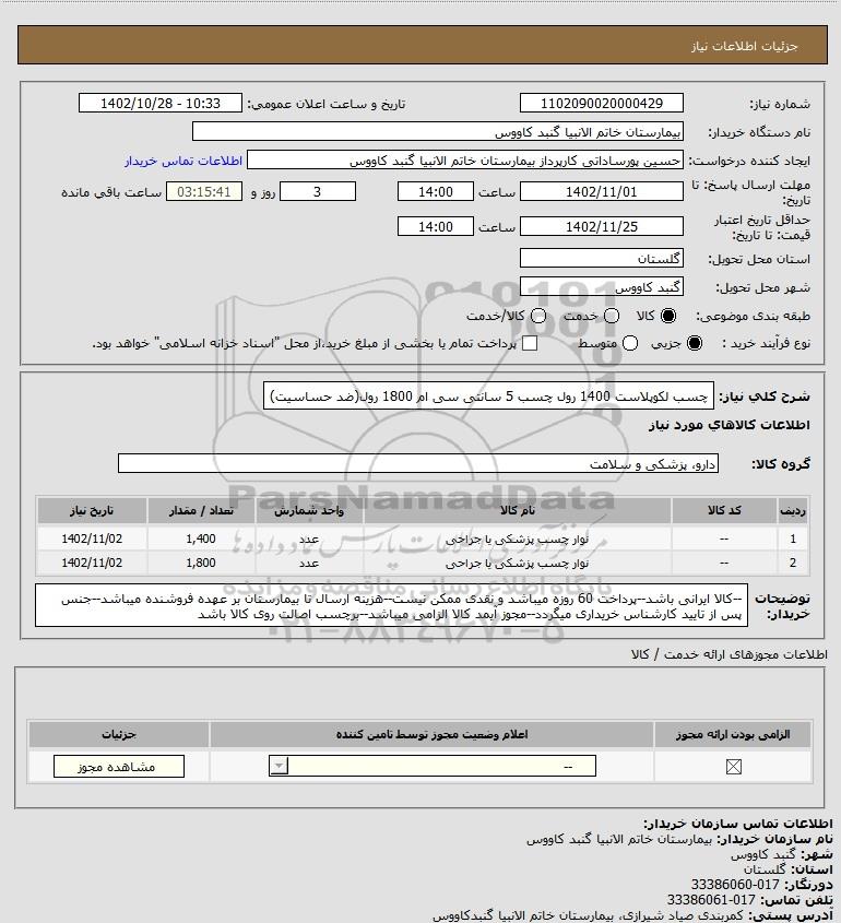 | 2 | -- | نوار چسب پزشکی یا جراحی | عدد | 1,800 | 1402/11/02 |