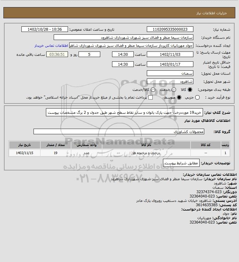 شرح کلی نیاز: خرید19 مورددرخت جهت پارک بانوان و سایر نقاط سطح شهر طبق جدول و 2 برگ مشخصات پیوست