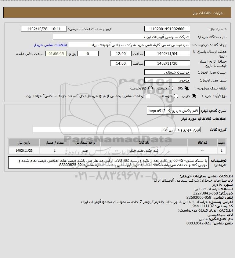 | 1 | -- | قلم چکش هیدرولیک | عدد | 1 | 1402/11/23 |