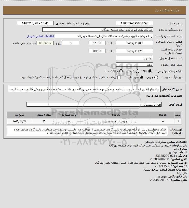 شرح کلی نیاز: بیلد والو (طبق لیست پیوست ) تایید و تحویل در منطقه نفتی بهرگان می باشد . مشخصات فنی و پیش فاکتور ضمیمه گردد.